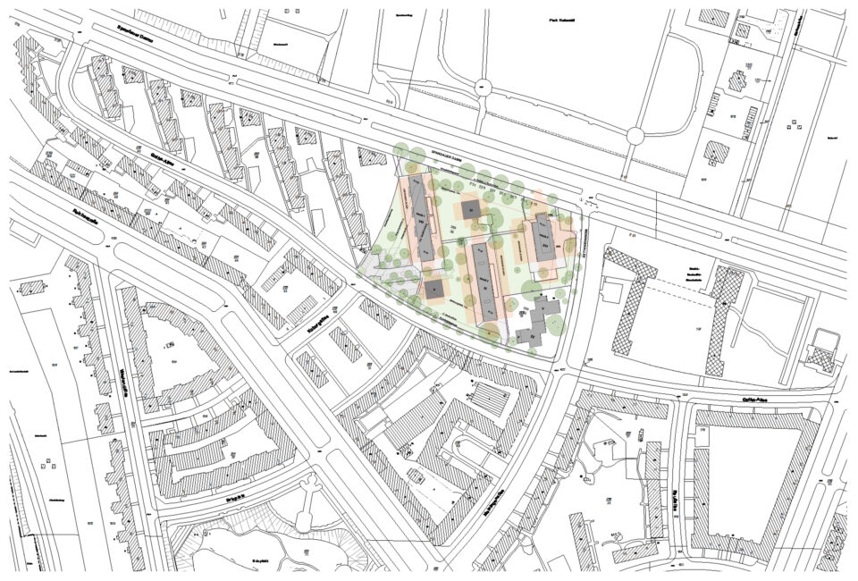 Die von uns entwickelten Varianten der ergänzenden Bebauung trägt diesem Umstand Rechnung. Die im bestehenden Ensemble in exemplarischer Weise umgesetzten städtebaulichen Prinzipien der 50ger Jahre, welche sich gerade nicht am tradierten, geschlossenen Blockrand orientieren, wird als entwurfliches Basisprinzip anerkannt und unter Berücksichtigung der heutigen Anforderungen an städtebauliche Setzungen weiterentwickelt.